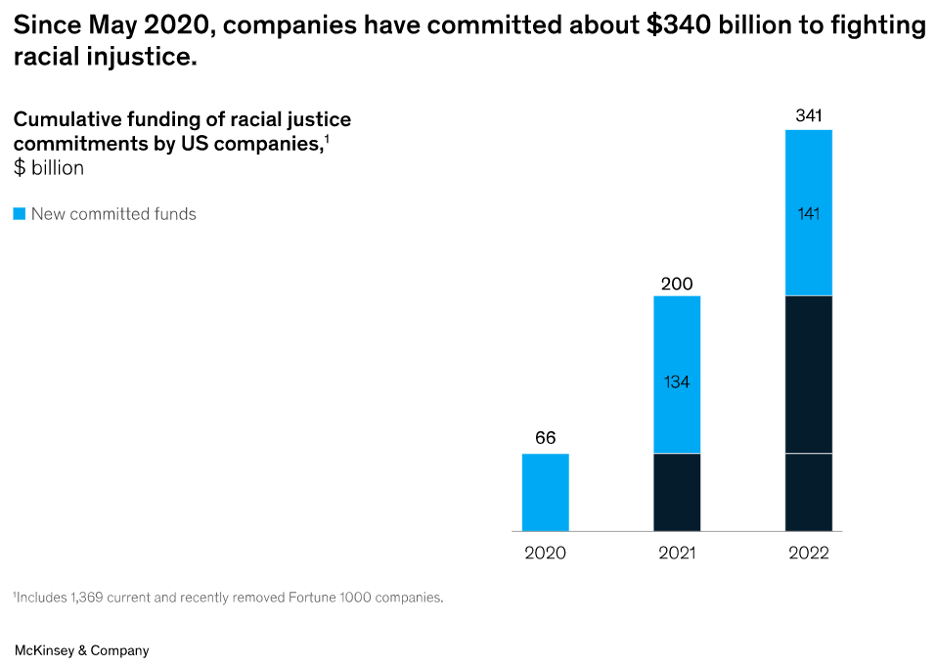 Between May 2020 and October 2022, U.S. companies have pledged more than $340B to support efforts that address racial equity and racial justice in America, according to a report published February 21, 2023 by the McKinsey Institute for Black Economic Mobility. The research was conducted to gain insight into how that money has been spent. However, the report offered inconclusive results.